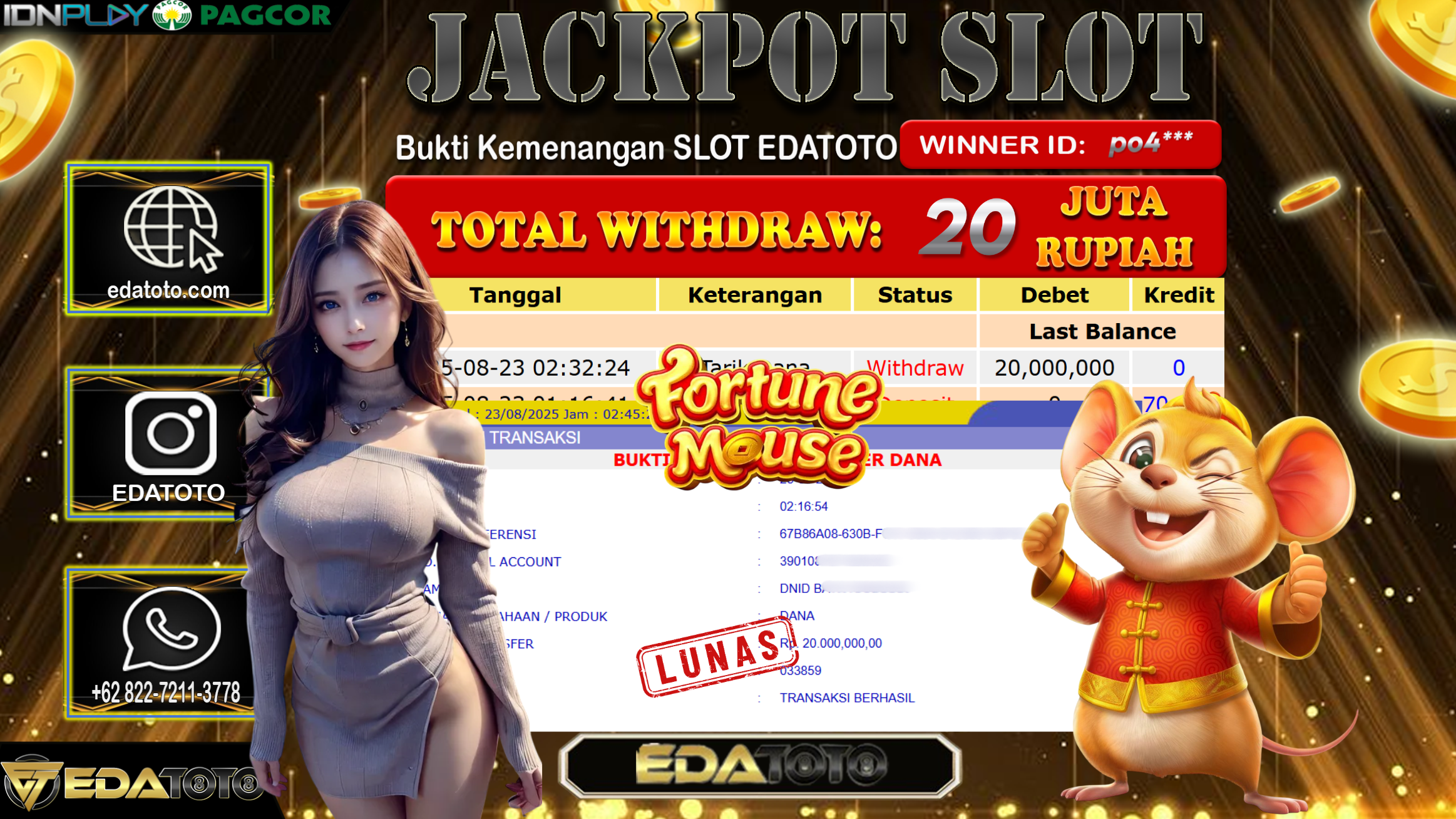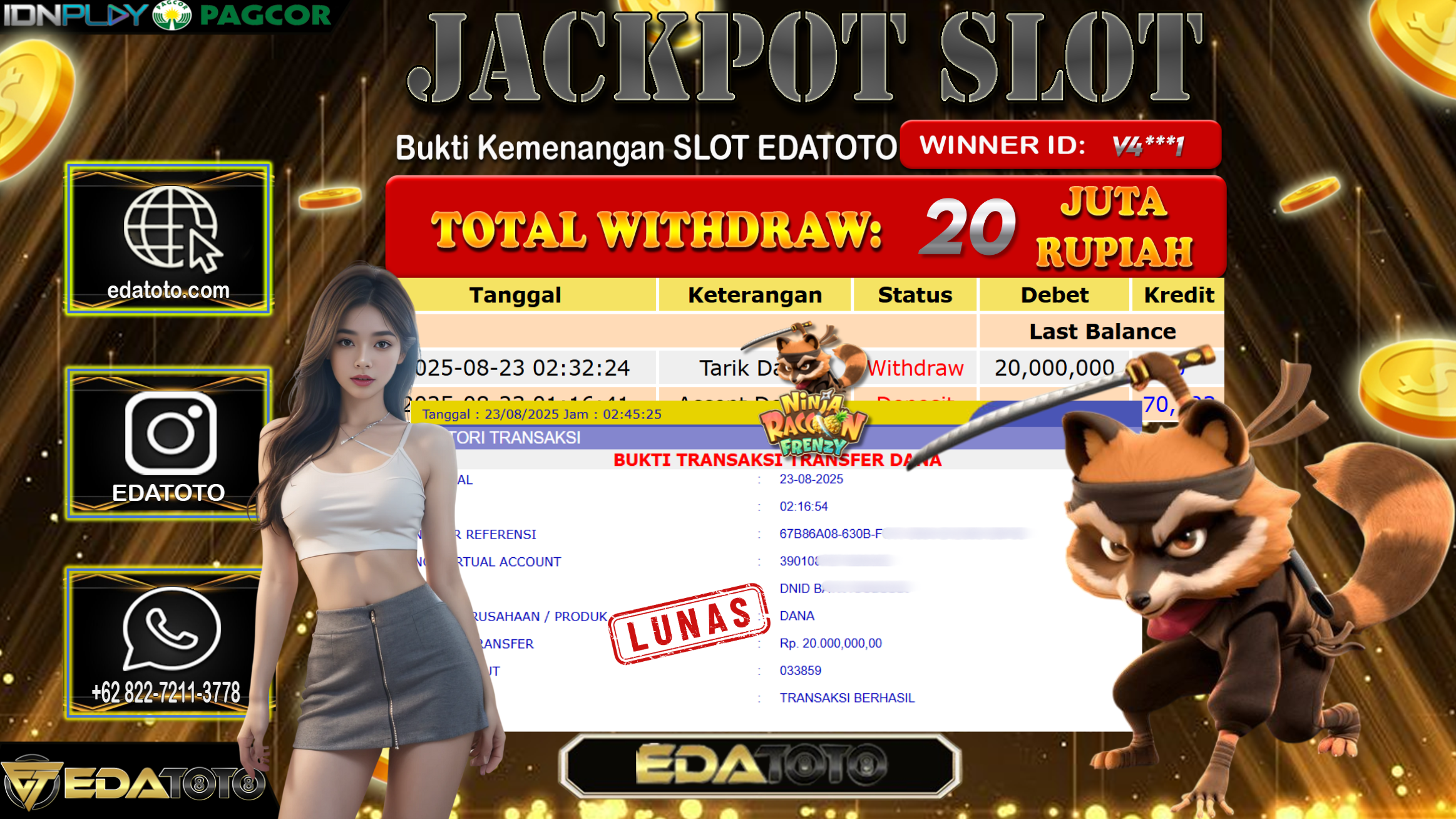 Selamat Kepada Pemilik user ID : V4***1 Hari/Tanggal : Sabtu/ 23, Agustus 2025 Jackpot : Rp. 20.000.000 JT Permainan : . . .