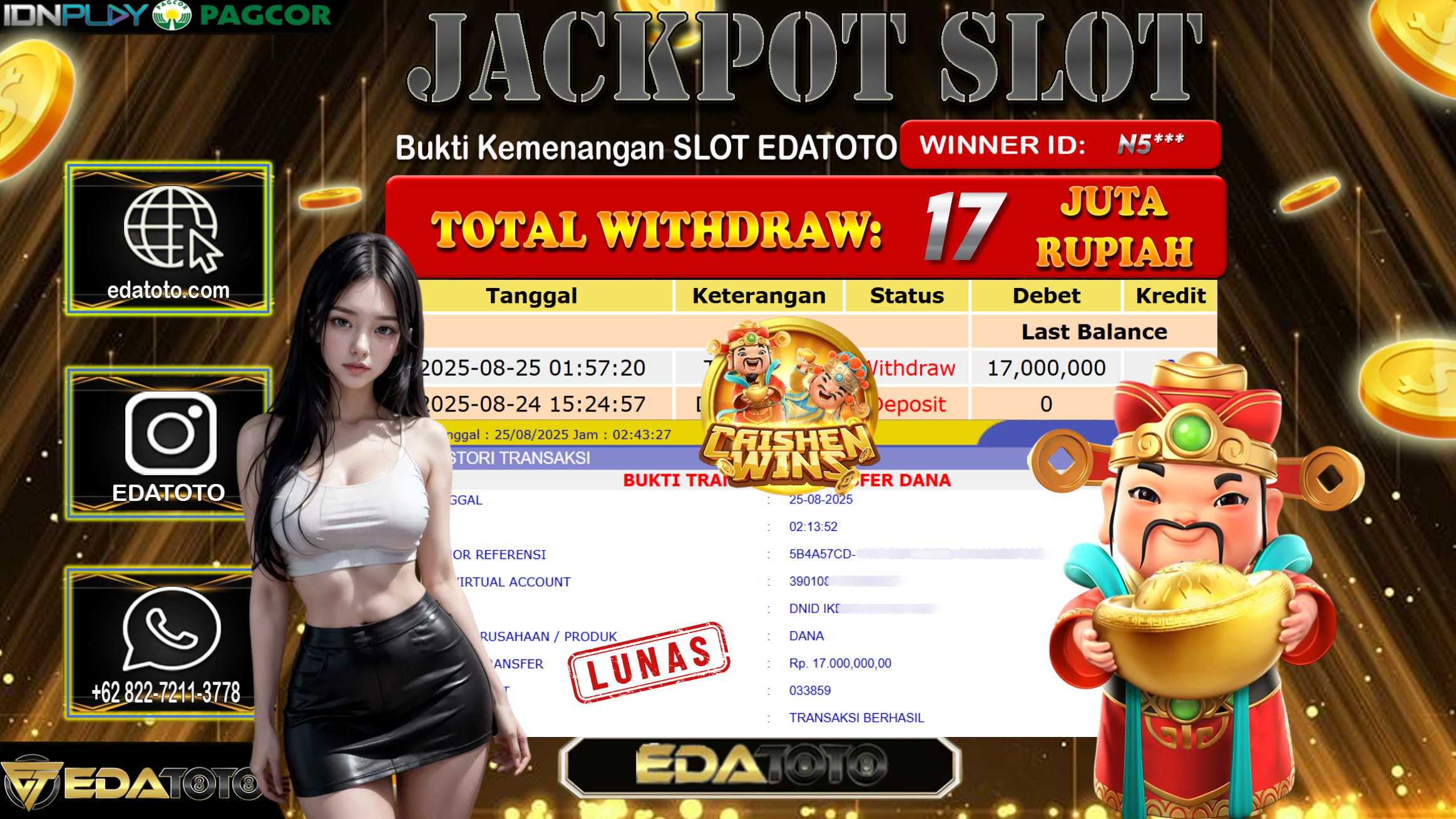 Selamat Kepada Pemilik user ID : N5*** Hari/Tanggal : Senin/ 25, Agustus 2025 Jackpot : Rp. 17.000.000 JT Permainan : . . .