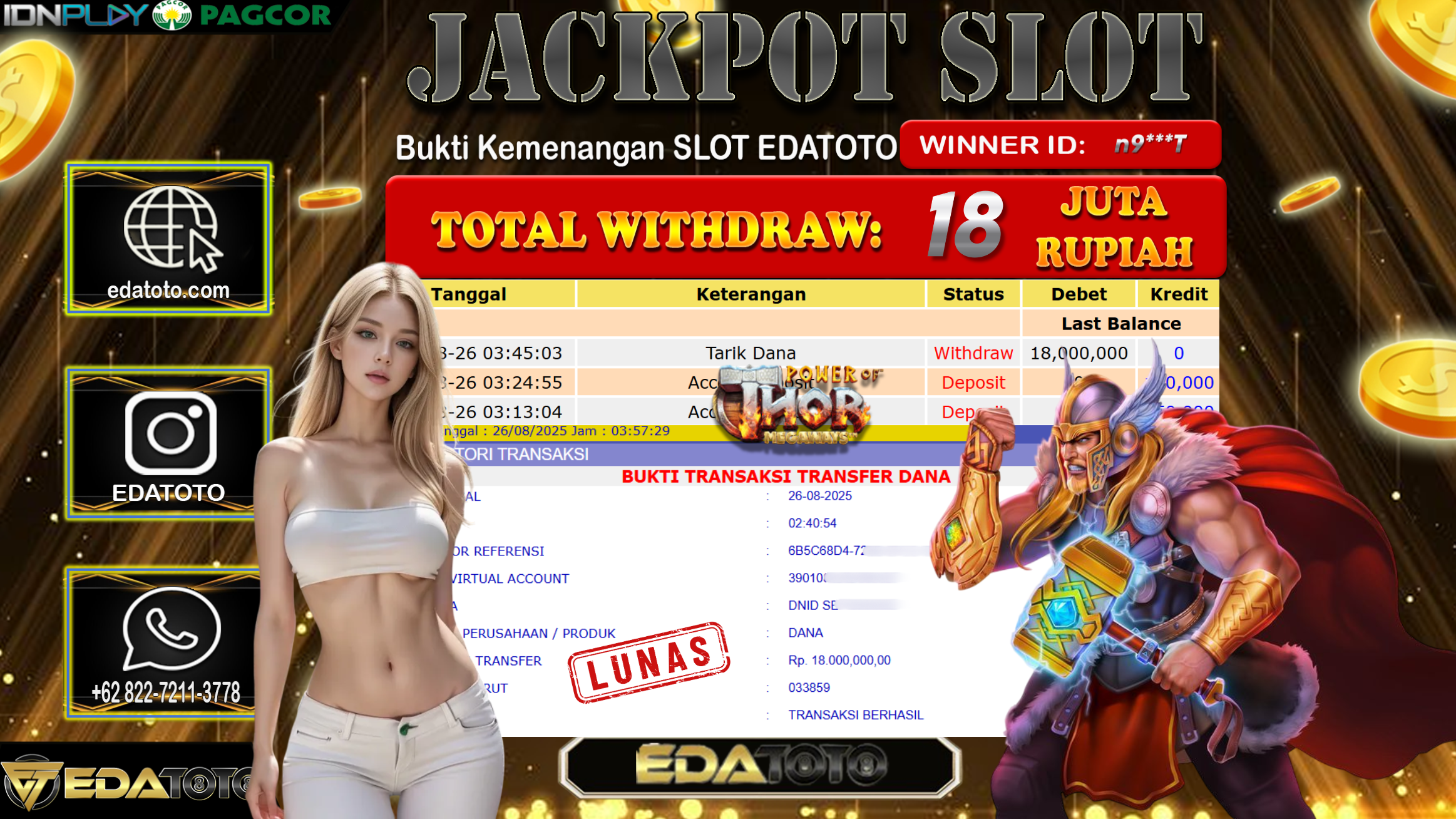 Selamat Kepada Pemilik user ID : n9***T Hari/Tanggal : Selasa/ 26, Agustus 2025 Jackpot : Rp. 18.000.000 JT Permainan : . . .
