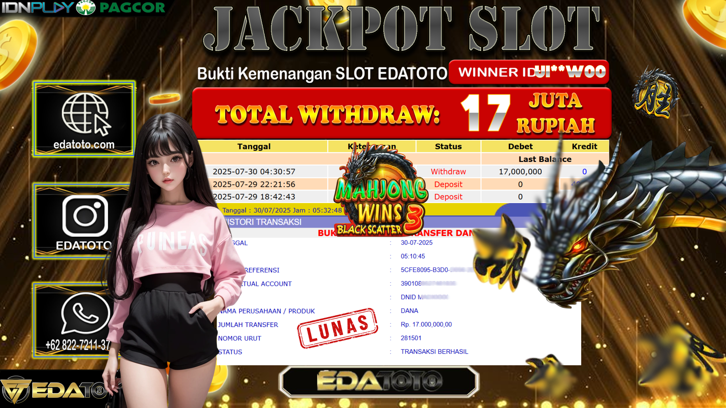 Selamat Kepada Pemilik user ID : UI**w00 Hari/Tanggal : Rabu/ 30, Juli 2025 Jackpot : Rp. 17.000.000 JT Permainan : Mahjong . . .