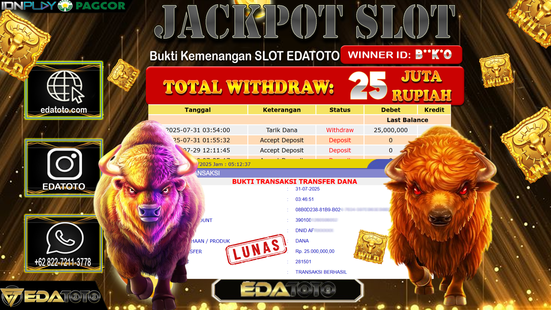Selamat Kepada Pemilik user ID : B**K*0 Hari/Tanggal : Kamis/ 31, Juli 2025 Jackpot : Rp. 25.000.000 JT Permainan : Buffalo . . .