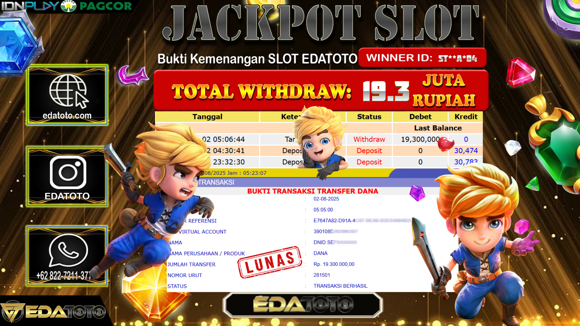Selamat Kepada Pemilik user ID : ST**A*04 Hari/Tanggal : Sabtu/ 2, Agustus 2025 Jackpot : Rp. 19.300.000 JT Permainan : . . .