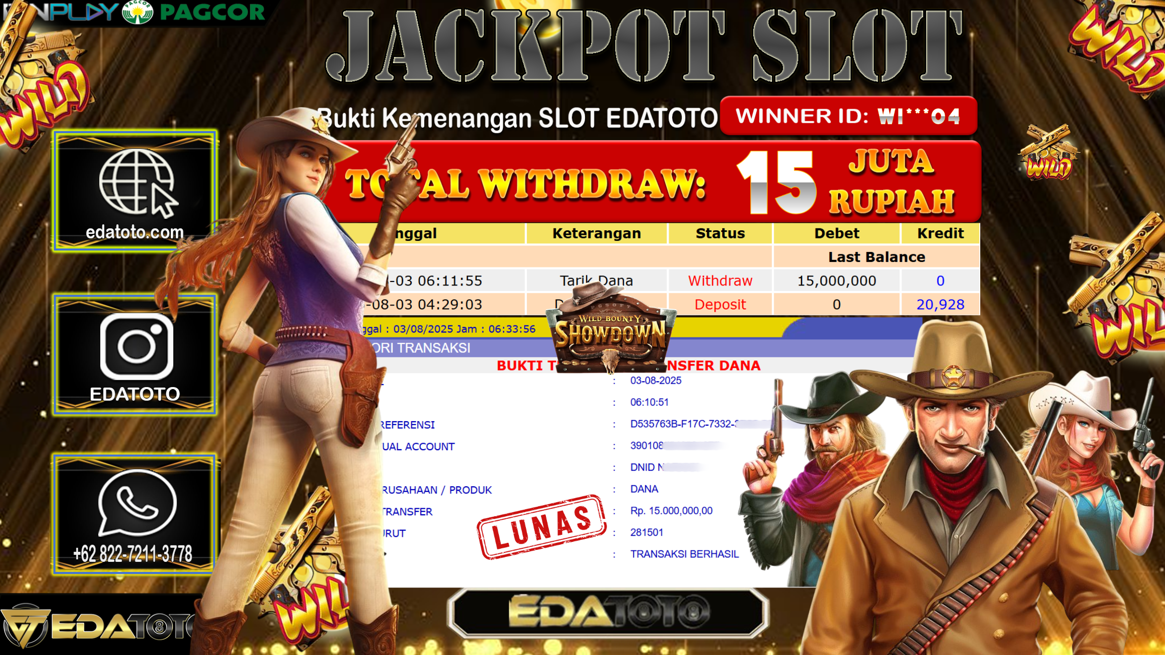 Selamat Kepada Pemilik user ID : WI***O4 Hari/Tanggal : Minggu/ 3, Agustus 2025 Jackpot : Rp. 15.000.000 JT Permainan : . . .