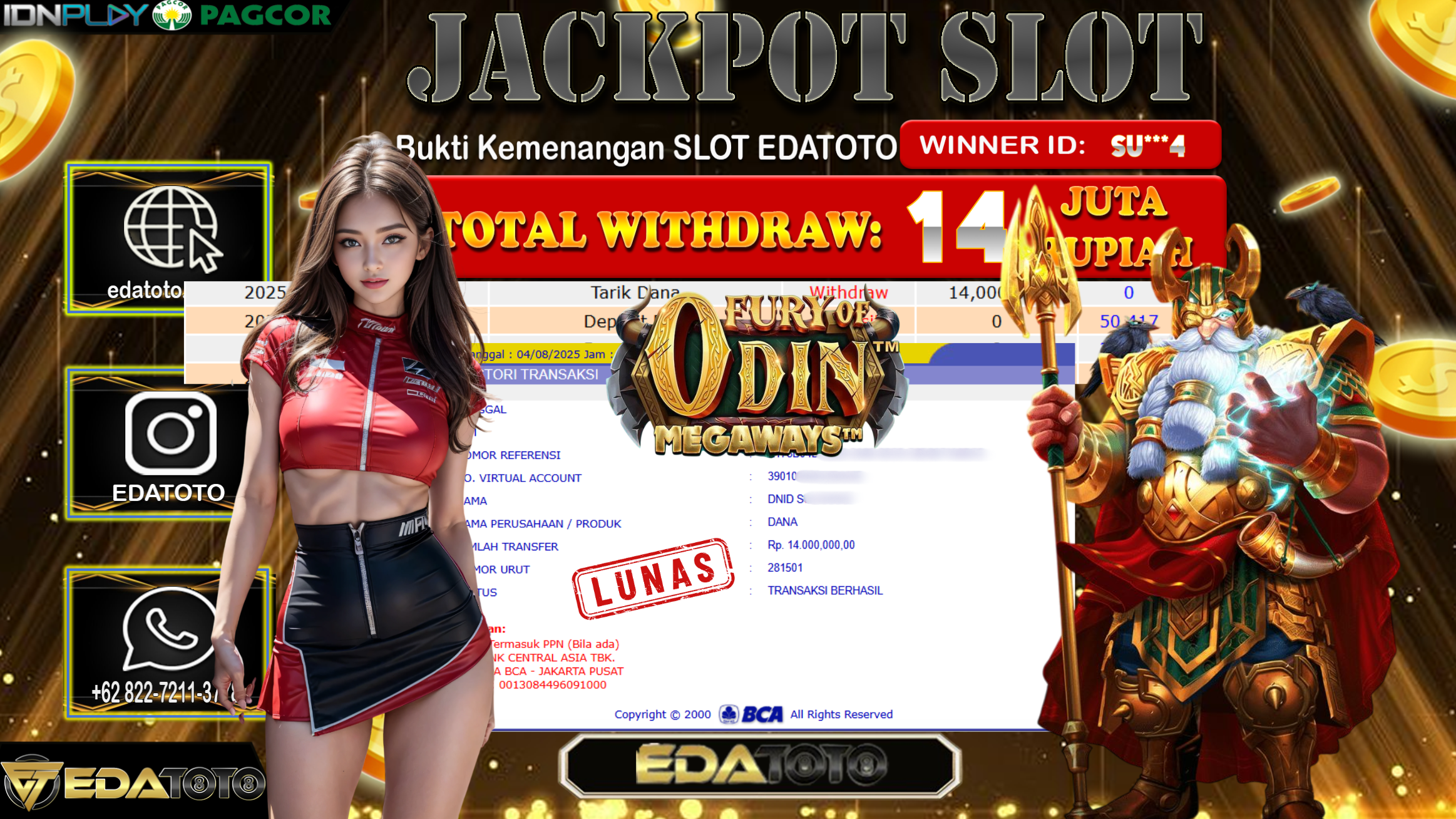 Selamat Kepada Pemilik user ID : Su***4 Hari/Tanggal : Senin/ 4, Agustus 2025 Jackpot : Rp. 14.000.000 JT Permainan : . . .
