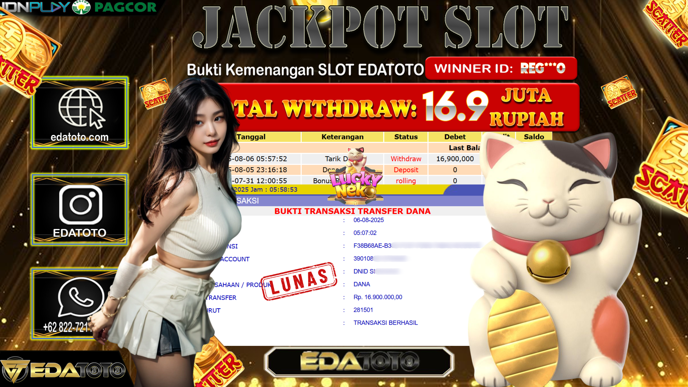 Selamat Kepada Pemilik user ID : Reg***0 Hari/Tanggal : Rabu/ 6, Agustus 2025 Jackpot : Rp. 16.900.000 JT Permainan : . . .