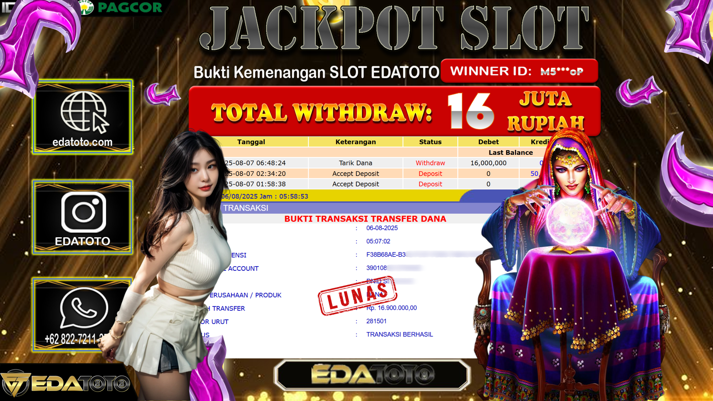 Selamat Kepada Pemilik user ID : M5***oP Hari/Tanggal : Kamis/ 7, Agustus 2025 Jackpot : Rp. 16.000.000 JT Permainan : . . .
