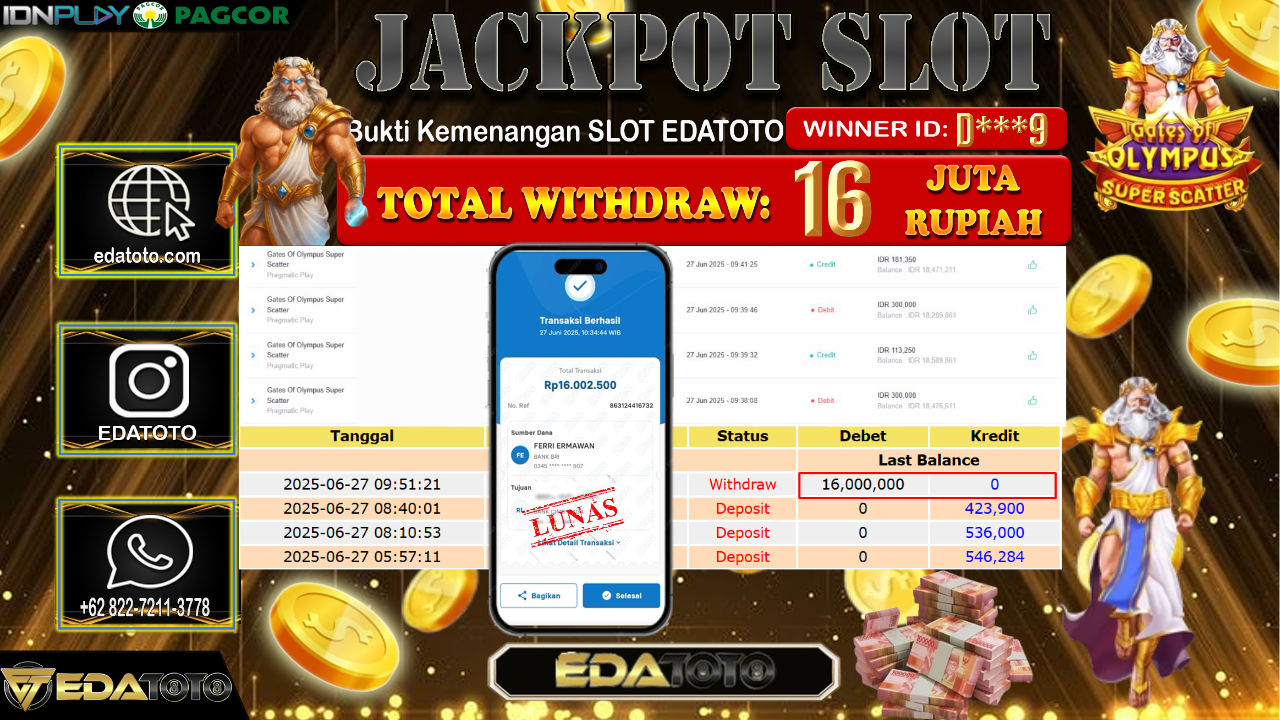 Selamat Kepada Pemilik user ID : D***9 Hari/Tanggal : Sabtu/ 28, Juni 2025 Jackpot : Rp. 16.000.000 JT Permainan : Gates . . .