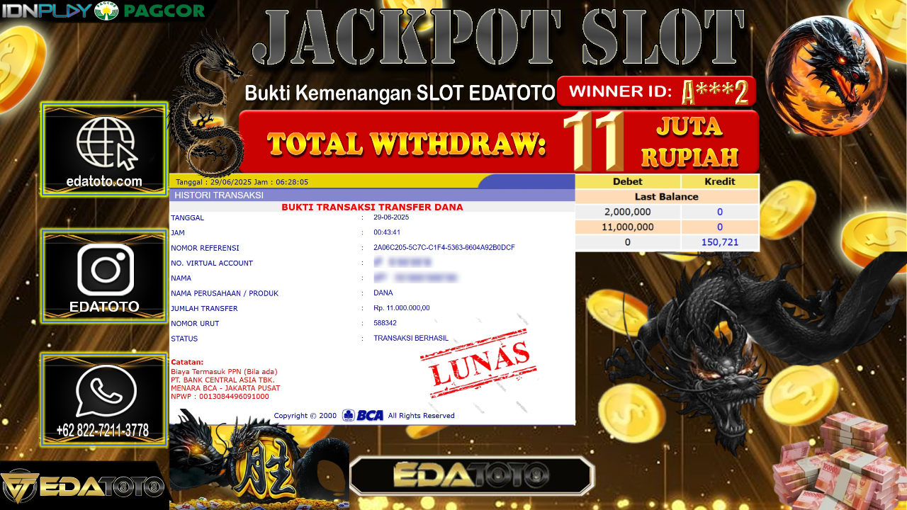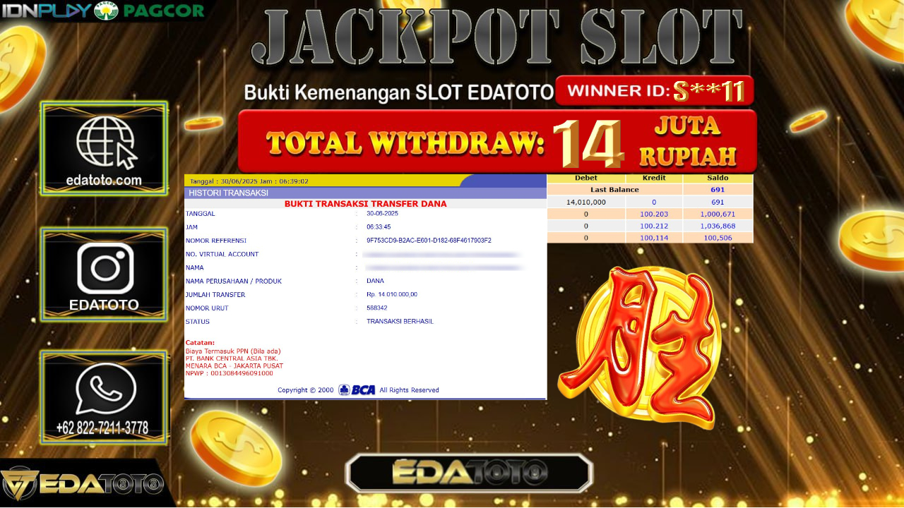 Selamat Kepada Pemilik user ID : S**11 Hari/Tanggal : Senin/ 30, Juni 2025 Jackpot : Rp. 14.000.000 JT Permainan : . . .