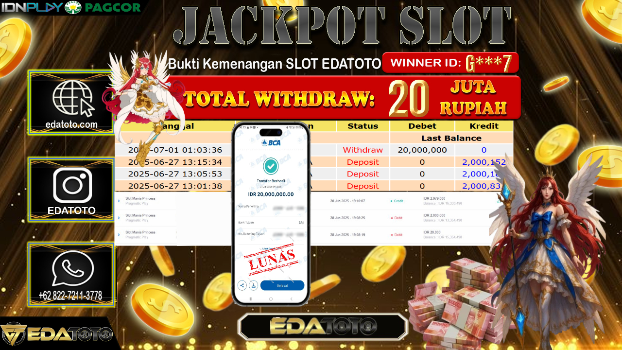 Selamat Kepada Pemilik user ID : G***7 Hari/Tanggal : Selasa/ 01, Juli 2025 Jackpot : Rp. 20.000.000 JT Permainan : . . .