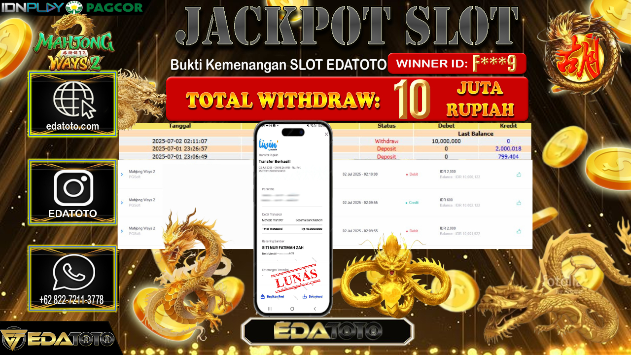 Selamat Kepada Pemilik user ID : F***9 Hari/Tanggal : Rabu/ 02, Juli 2025 Jackpot : Rp. 10.000.000 JT Permainan : . . .