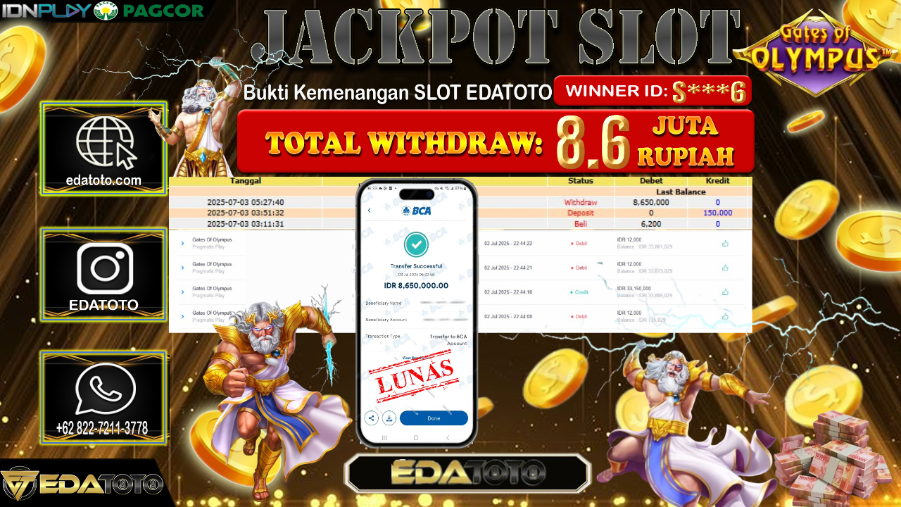 Selamat Kepada Pemilik user ID : S***6 Hari/Tanggal : Kamis/ 03, Juli 2025 Jackpot : Rp. 8.600.000 JT Permainan : . . .