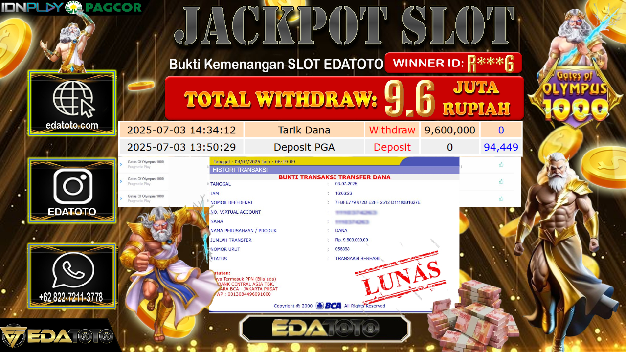 Selamat Kepada Pemilik user ID : R***6 Hari/Tanggal : Jum’at/ 04, Juli 2025 Jackpot : Rp. 9.600.000 JT Permainan : . . .