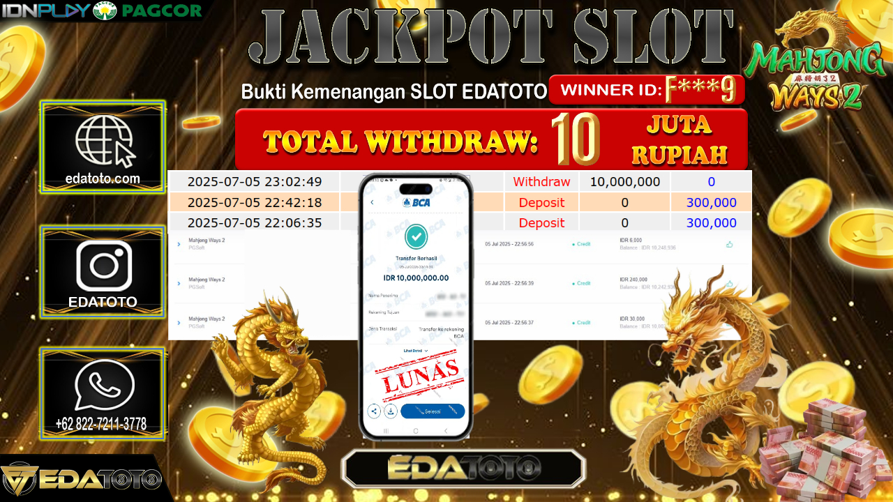 Selamat Kepada Pemilik user ID : F***9 Hari/Tanggal : Minggu/ 06, Juli 2025 Jackpot : Rp. 10.000.000 JT Permainan : . . .