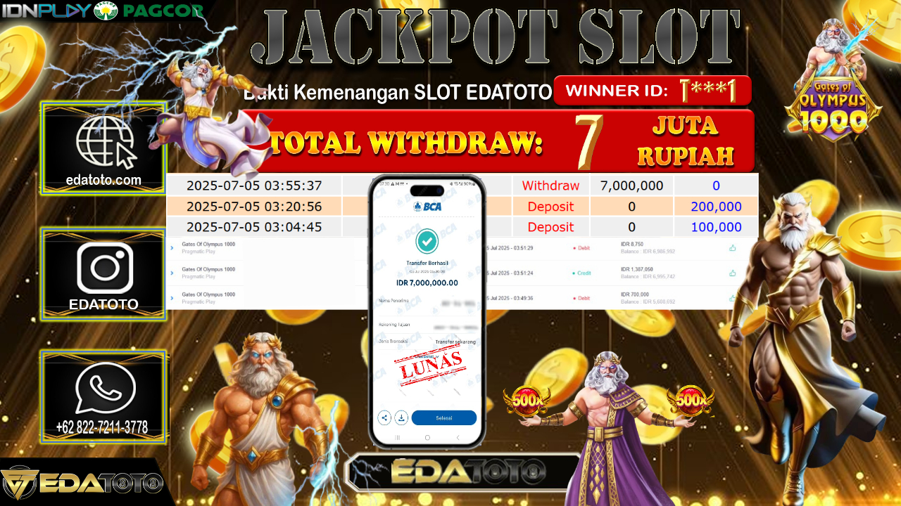 Selamat Kepada Pemilik user ID : T***1 Hari/Tanggal : Sabtu/ 05, Juli 2025 Jackpot : Rp. 7.000.000 JT Permainan : . . .