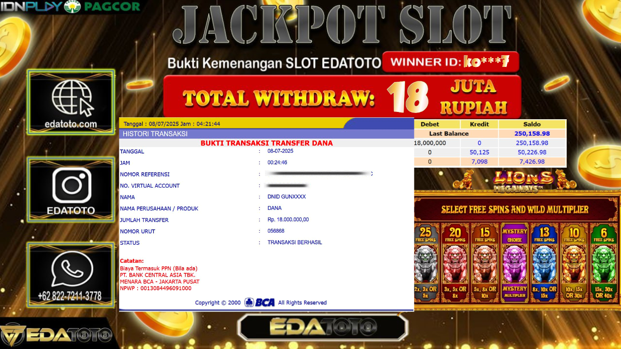 Selamat Kepada Pemilik user ID : Ko***7 Hari/Tanggal : Selasa/ 08, Juli 2025 Jackpot : Rp. 18.000.000 JT Permainan : 5 . . .