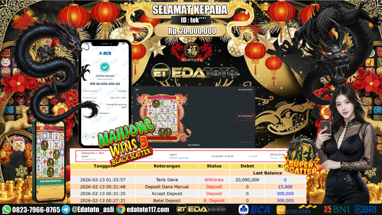 Selamat Kepada Pemilik user ID : tok**** Hari/Tanggal : Jumat/ 13 februari 2026 Jackpot : Rp.25,000,000 JT Withdraw : 20,000,000 . . .