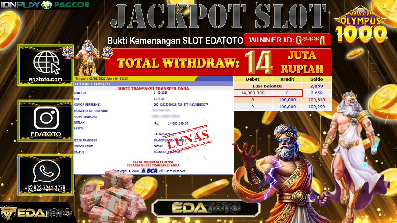 Selamat Kepada Pemilik user ID : G***A Hari/Tanggal : Senin/ 02, Juni 2025 Jackpot : Rp. 14.000.000 JT Permainan : Gates Of . . .