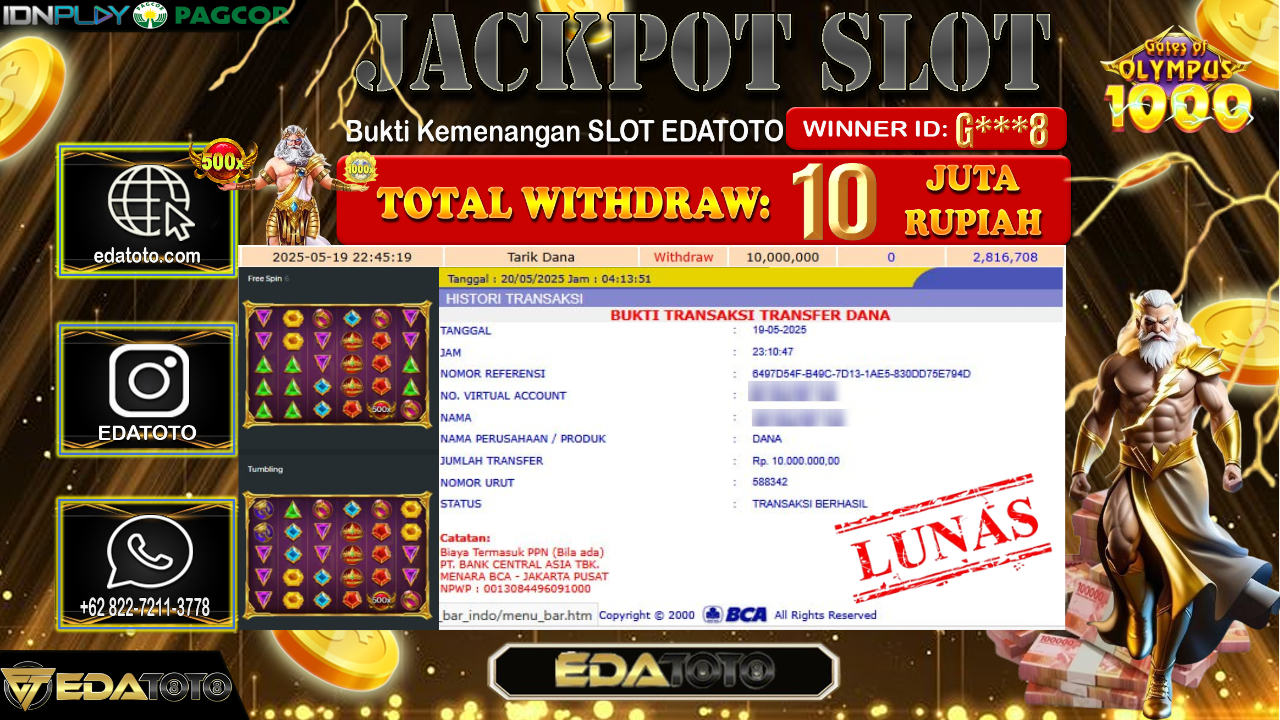 Selamat Kepada Pemilik user ID : G***8 Hari/Tanggal : Selasa/ 20, Mei 2025 Jackpot : Rp. 10.000.000 JT Permainan . . .