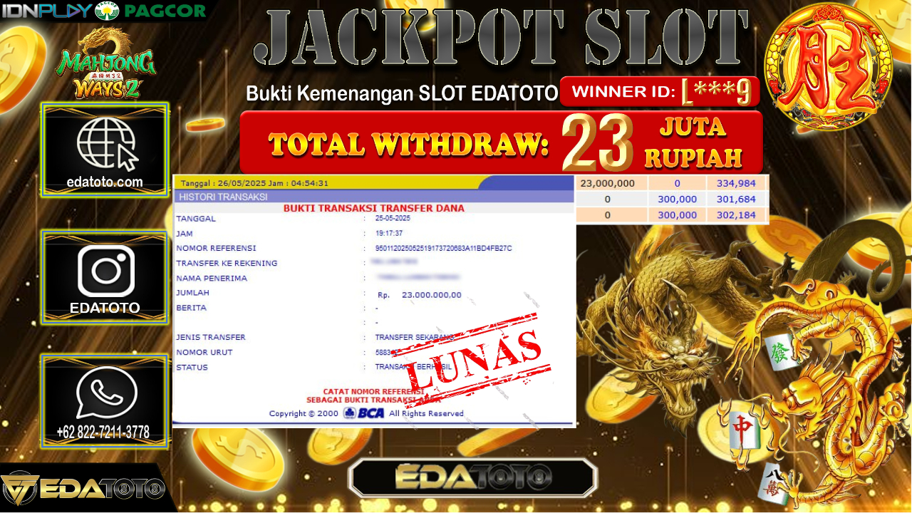 Selamat Kepada Pemilik user ID : L***9 Hari/Tanggal : Senin/ 26, Mei 2025 Jackpot : Rp. 23.000.000 JT Permainan : Mahjong . . .