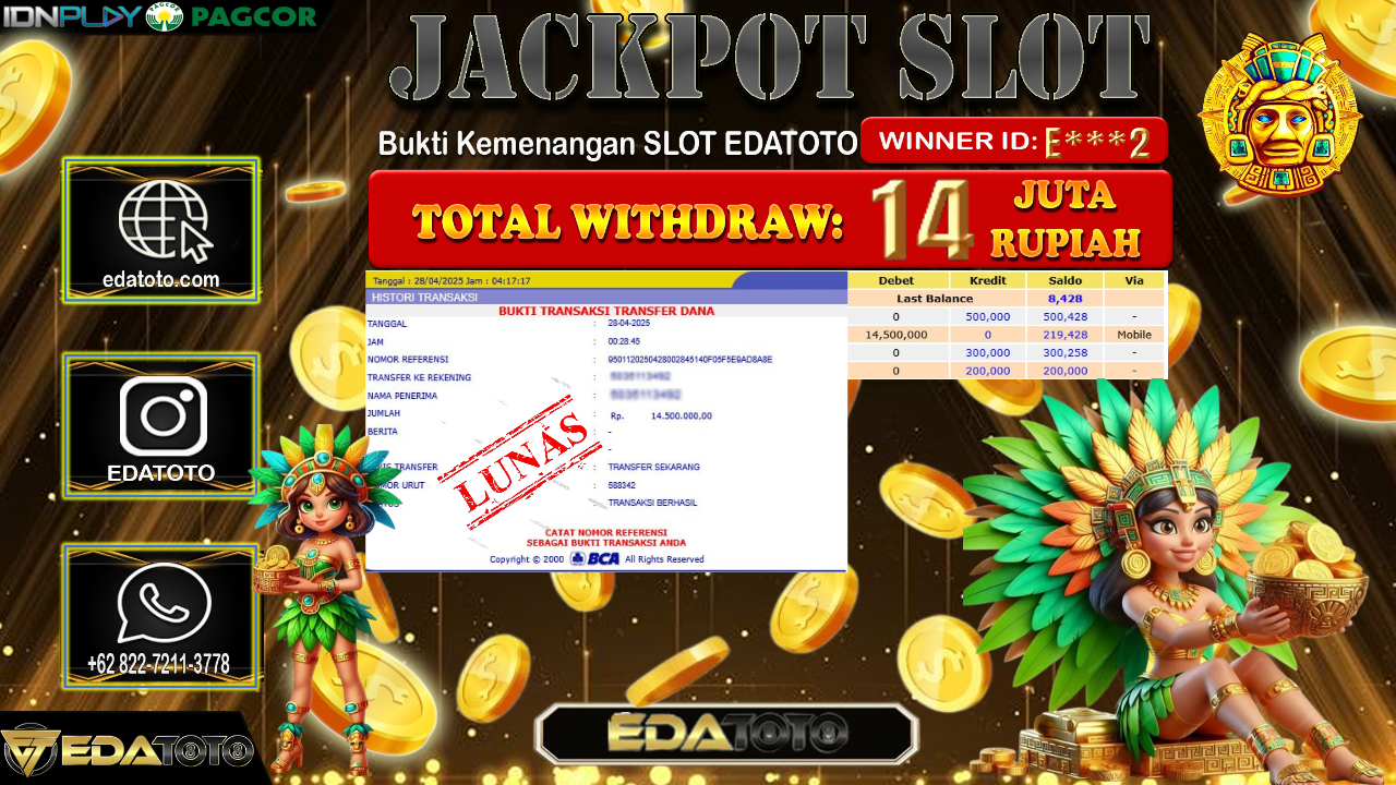 Selamat Kepada Pemilik user ID : E***2 Hari/Tanggal : Senin / 28, April 2025 Jackpot : Rp. 14.500.000 JT Permainan : Aztec . . .