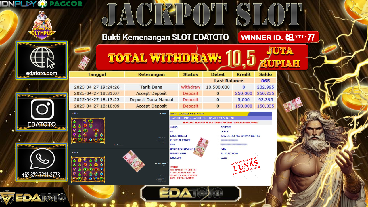 Selamat Kepada Pemilik user ID : CEL****77 Hari/Tanggal : Senin / 28, April 2025 Jackpot : Rp. 10.500.000 JT Permainan : GATES . . .