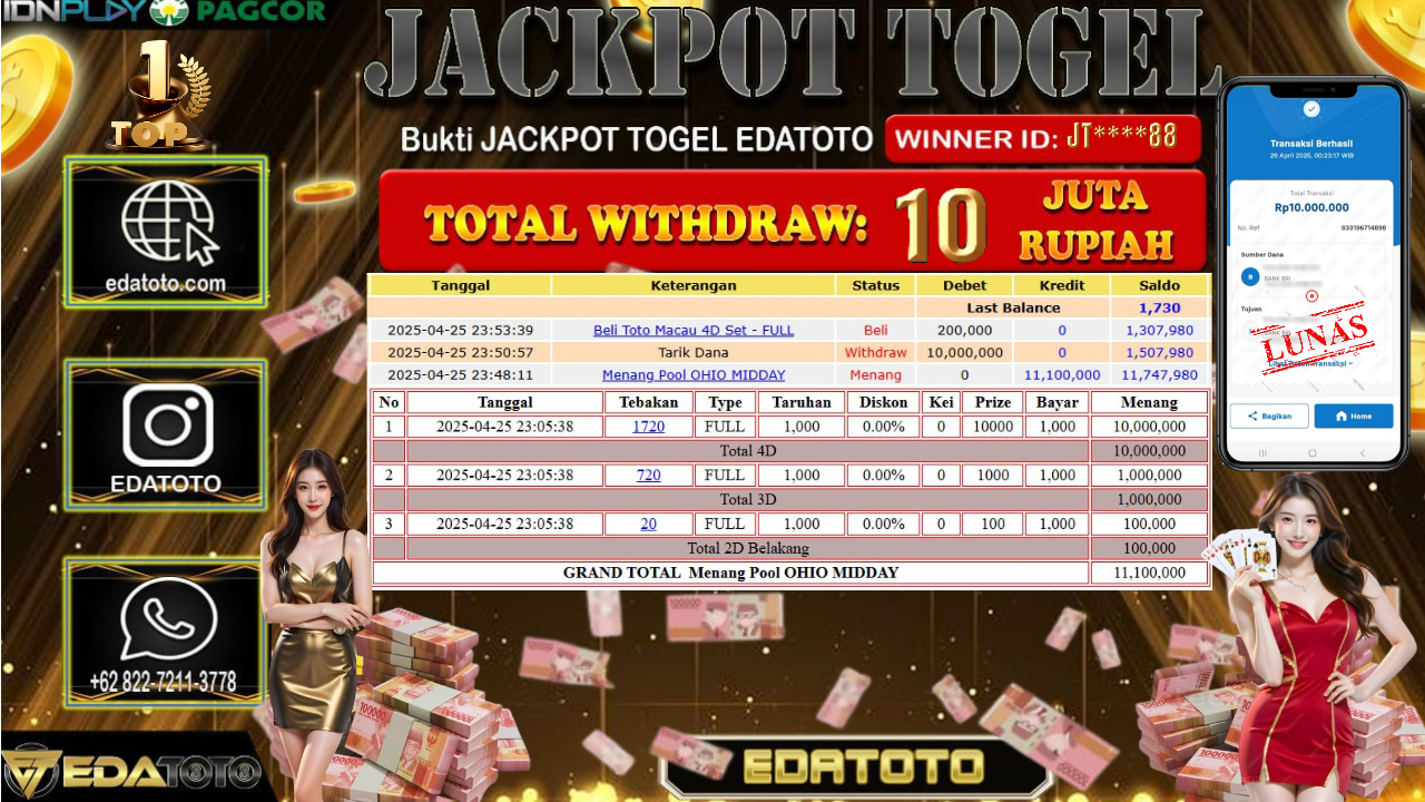 Selamat Kepada Pemilik user ID : JT****88 Hari/Tanggal : Sabtu/ 26 , April 2025 Jackpot : Rp. 10.000.000 JT Permainan : . . .