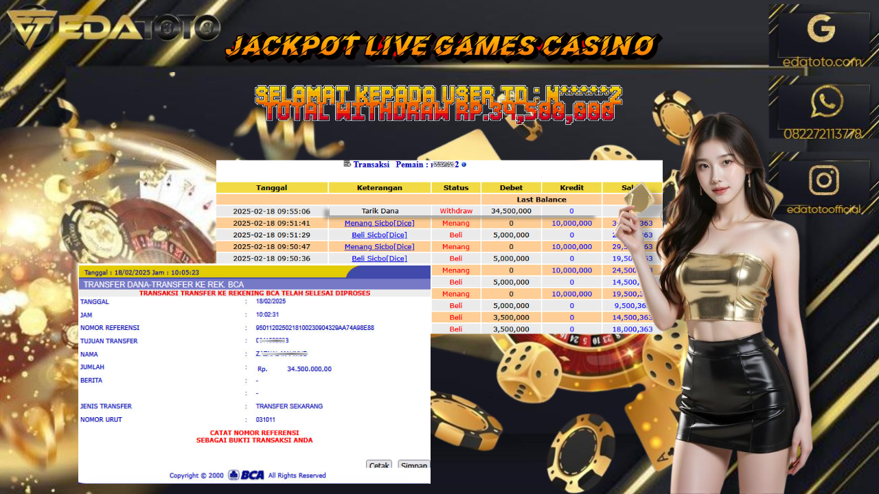 Selamat Kepada Pemilik user ID : n*****2 Hari/Tanggal : Senin / 18 , FEBRUARY 2025 Jackpot : Rp. 34.500.000 JT . . .