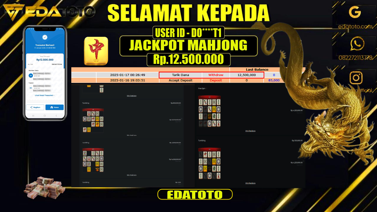 Selamat Kepada Pemilik user ID :  DO****T1 Hari/Tanggal : JUMAT / 17 , JANUARY 2025 Jackpot : Rp. 12.500.000 . . .