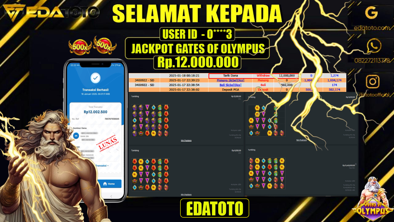 Selamat Kepada Pemilik user ID :  O****3 Hari/Tanggal : SABTU/ 18 , JANUARY 2025 Jackpot : Rp. 16.000.000 JT Permainan . . .
