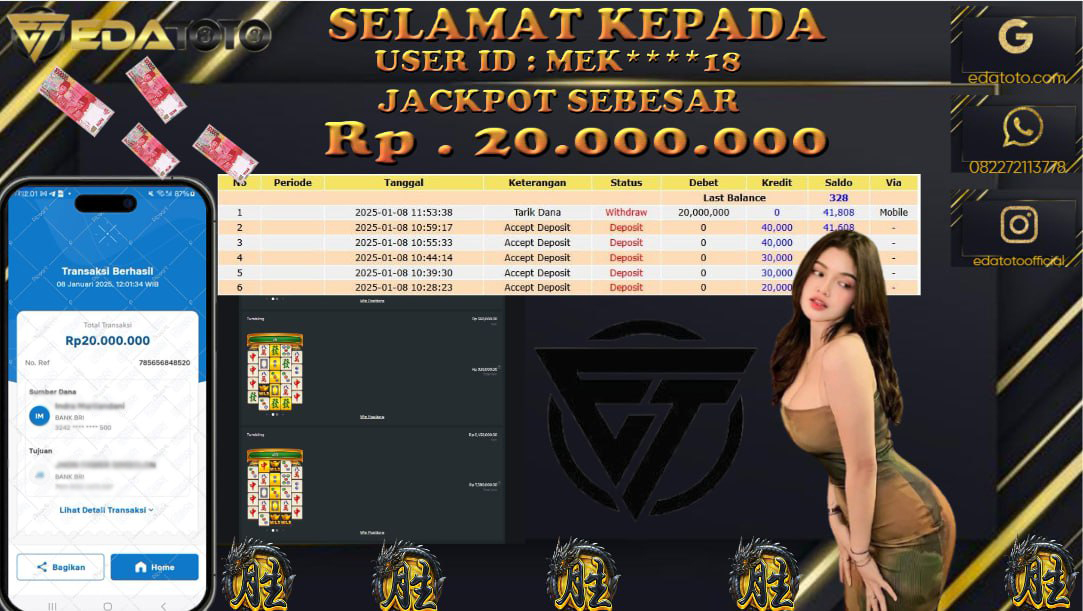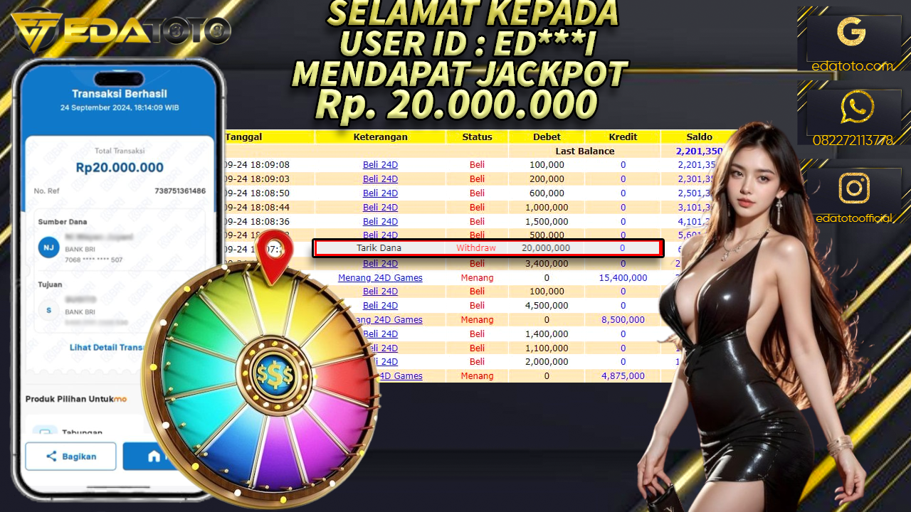 Selamat Kepada Pemilik user ID : ED*****I Hari/Tanggal : Jumat/ 12 DESEMBER 2024 Jackpot : Rp. 20.000.000 JT Permainan : . . .