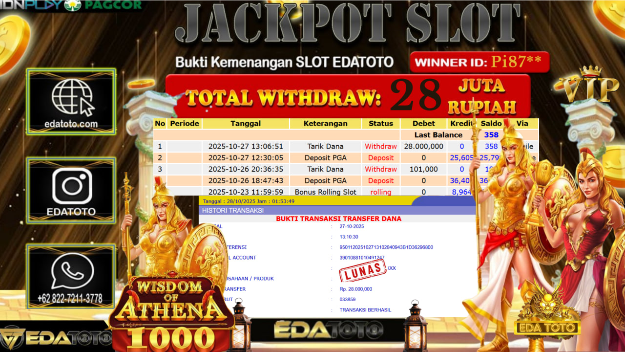 Selamat Kepada Pemilik user ID : Pi87** Hari/Tanggal : Senin / 27, Oktober 2025 Jackpot : Rp. 28.000.000 JT Permainan : Wisdom . . .