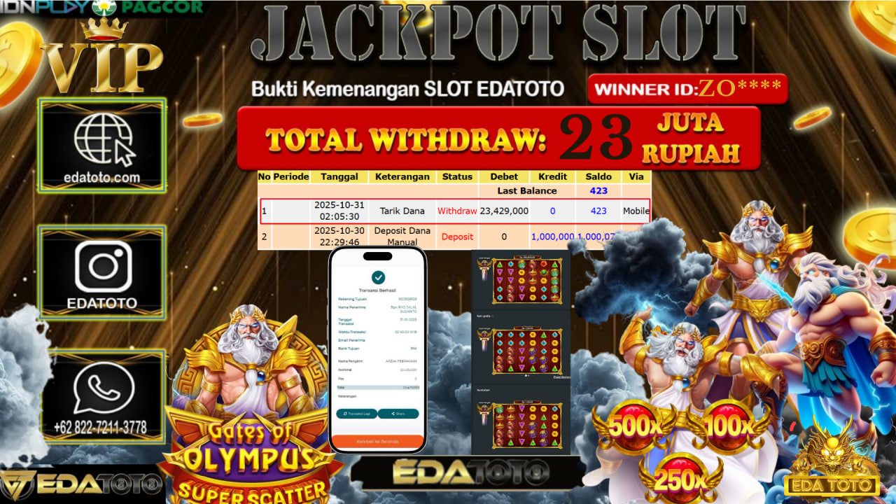 Selamat Kepada Pemilik user ID : ZO**** Hari/Tanggal : Jumat / 31, Oktober 2025 Jackpot : Rp. 23.000.000 JT Permainan : Gates Of . . .