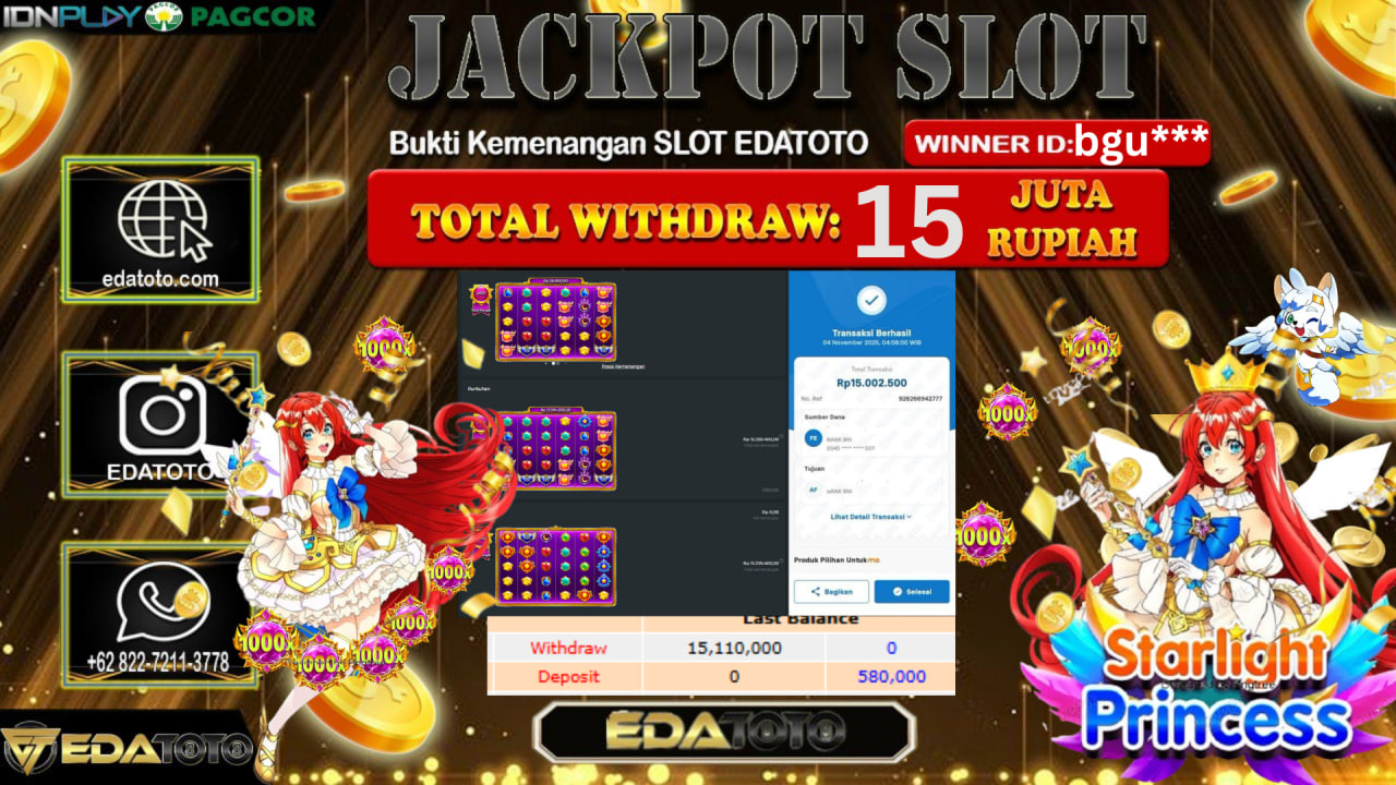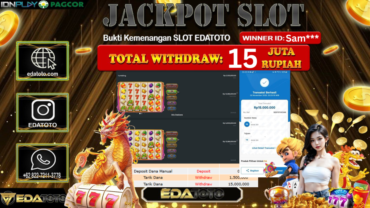 Selamat Kepada Pemilik user ID : Sam**** Hari/Tanggal : Sabtu / 2, November 2025 Jackpot : Rp. 15.000.000 JT Permainan . . .