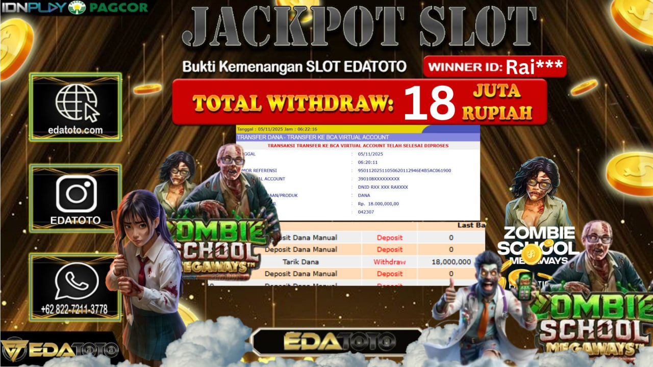 Jackpot : Rp. 18,000,000 JT Withdraw :18,000,000 JT Permainan : Zombie School Megaways Selamat kepada member setia EDATOTO telah mendapatkan JP . . .