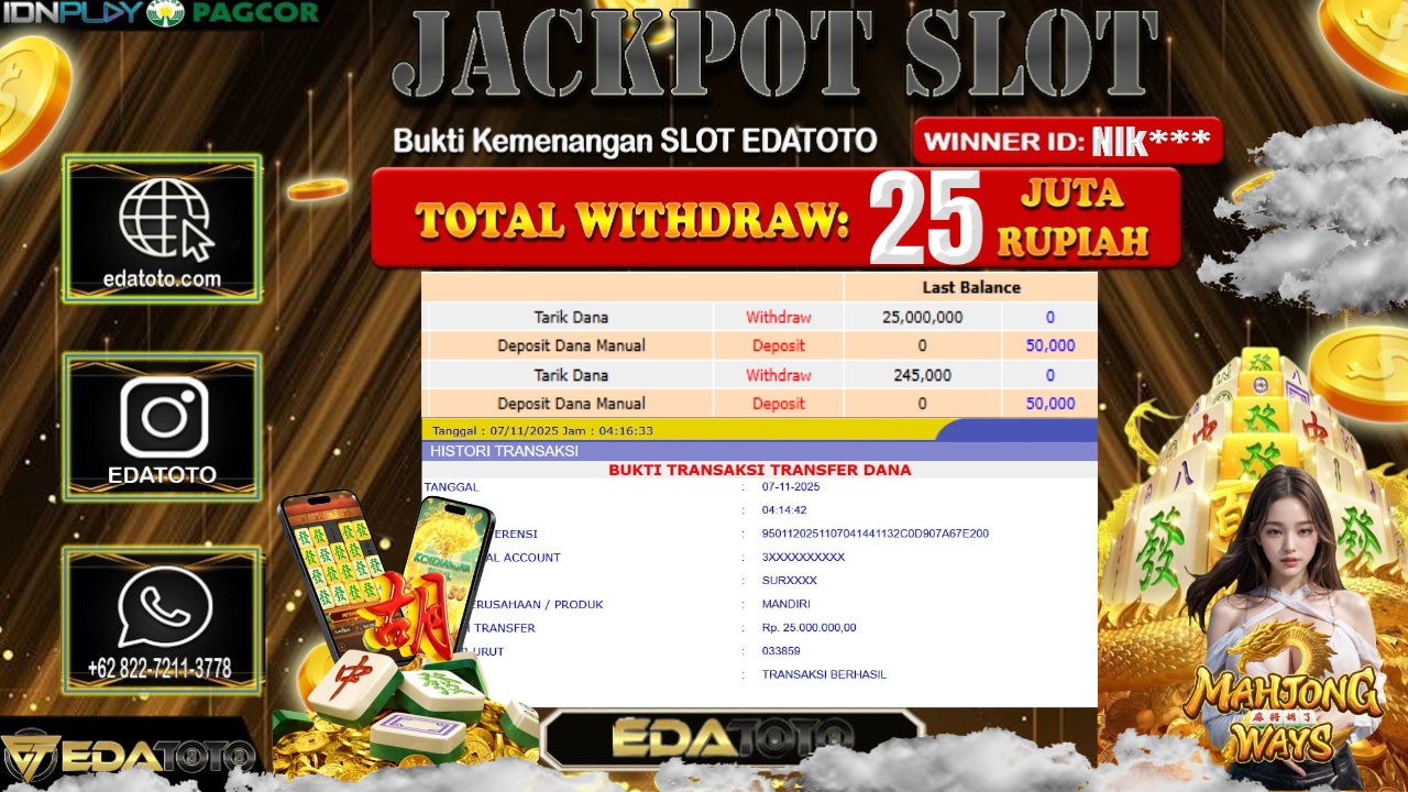 Selamat Kepada Pemilik user ID : Nik*** Hari/Tanggal : RABU / 5, November 2025 Jackpot : Rp. 25,000,000 JT Withdraw :25,000,000 . . .