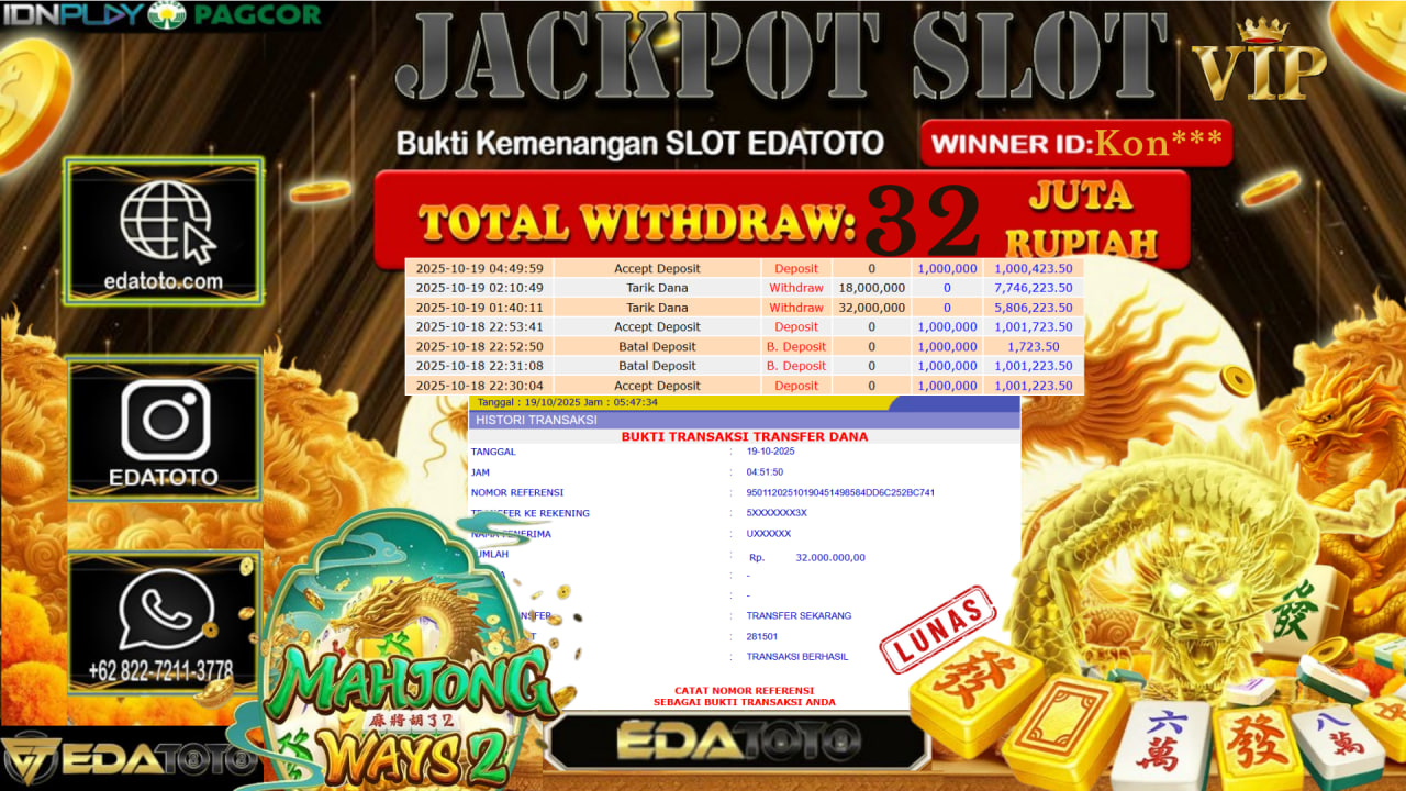 Selamat Kepada Pemilik user ID : Kon*** Hari/Tanggal : Minggu/ 19, Oktober 2025 Jackpot : Rp. 32.000.000 JT Permainan : . . .